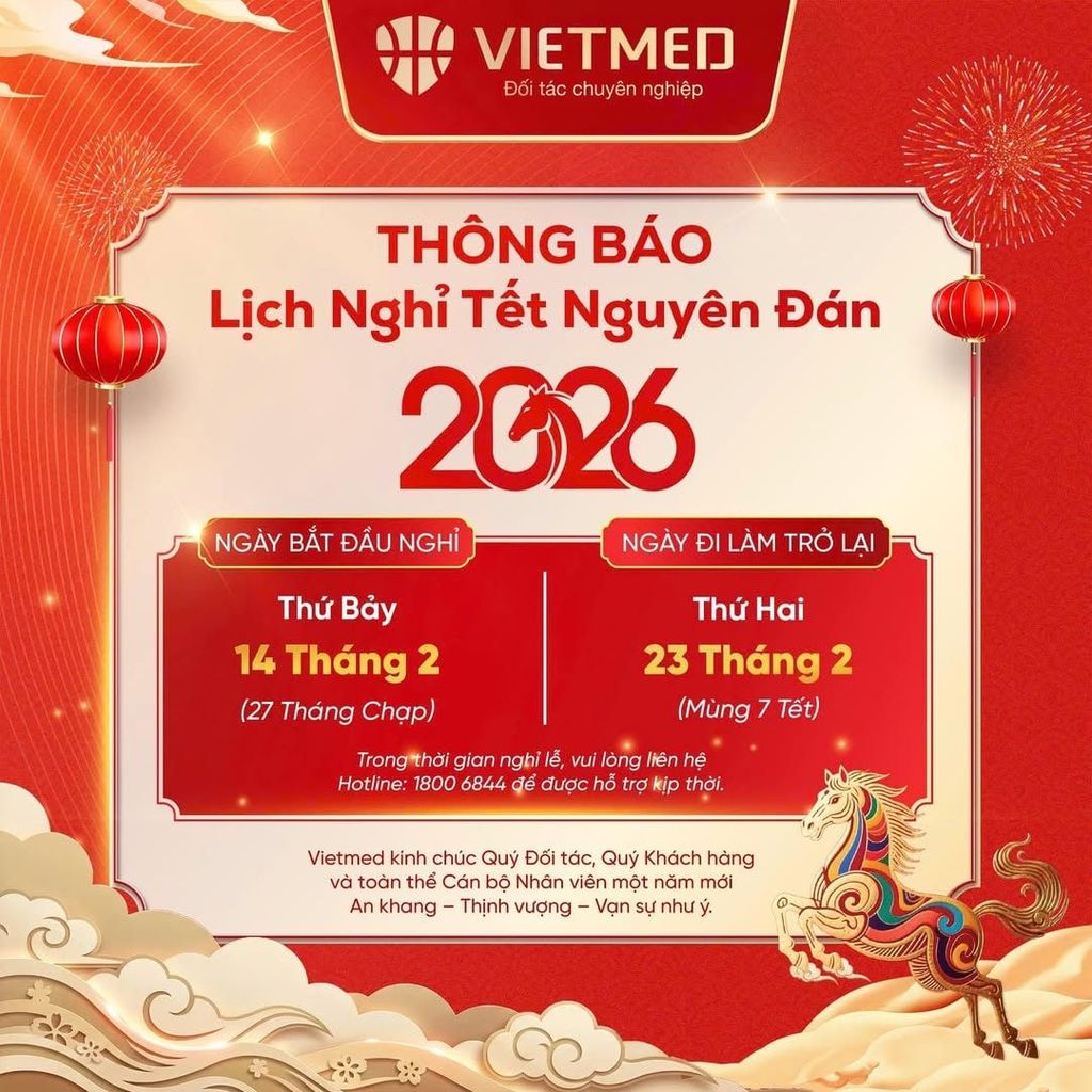 Nhân dịp Tết Nguyên Đán Bính Ngọ 2026, Công ty Vietmed xin trân trọng thông báo tới Quý đối tác và Quý khách hàng lịch nghỉ Tết của công ty như sau: