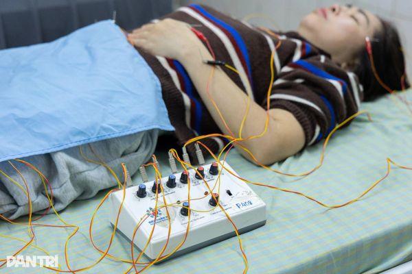 Khoảng 9h, bác sĩ bắt đầu thiết lập các thông số trên máy xung điện, lần lượt gắn từng sợi dây lên chi dưới của bệnh nhân, giúp kích thích vùng cơ bị liệt.