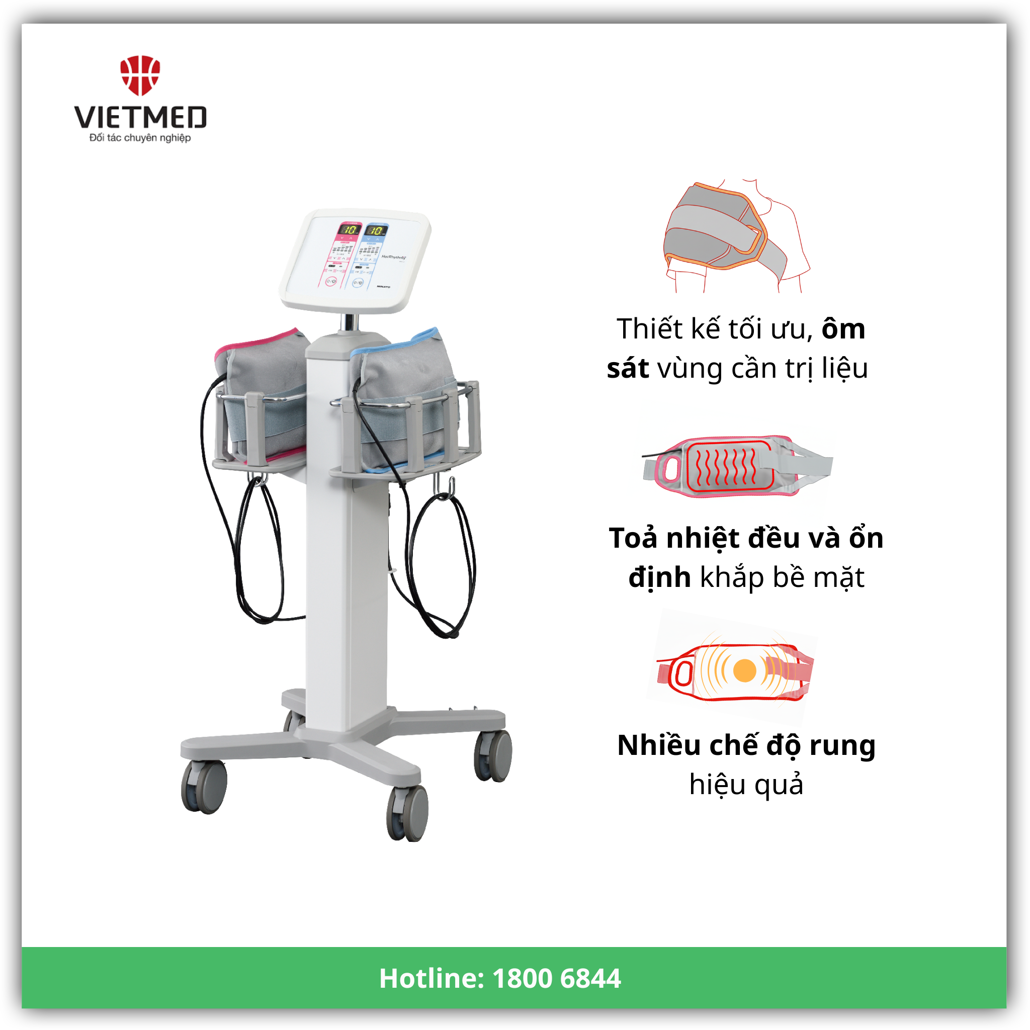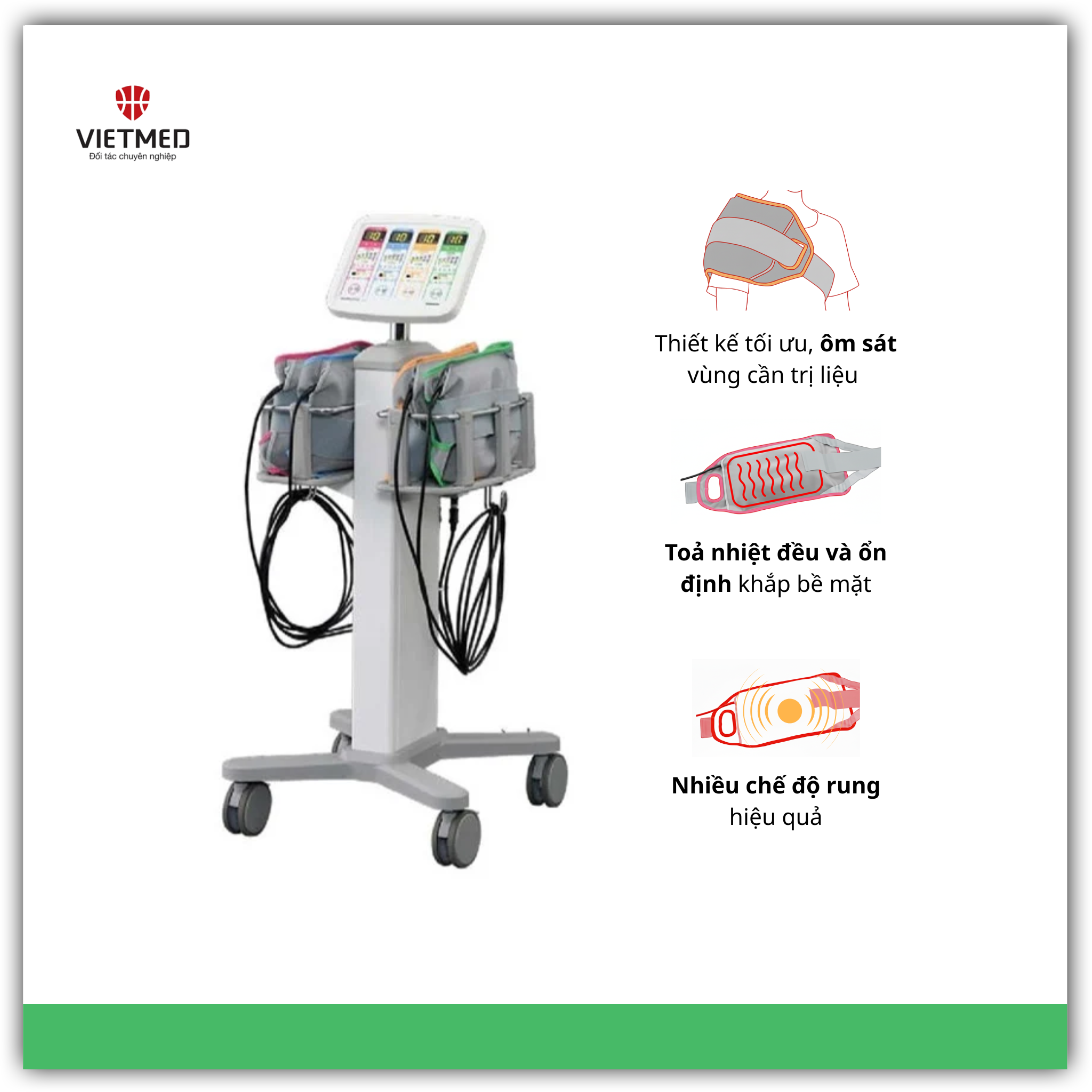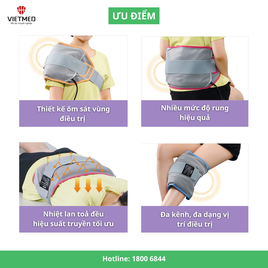 Có thể thay đổi cường độ nhiệt, thời gian điều trị — dễ dàng cá nhân hóa phác đồ theo từng bệnh nhân, từng tình trạng (viêm – đau cơ – sưng – co cứng – phục hồi sau chấn thương).