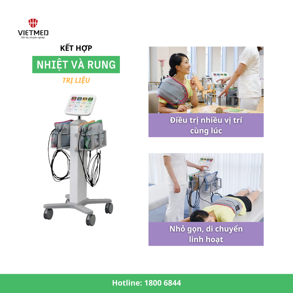 Máy sử dụng sóng nhiệt cao tần để truyền nhiệt sâu vào trong mô mềm, giúp tăng tuần hoàn máu, giãn cơ, giảm co cứng, hỗ trợ tái tạo mô sau chấn thương hoặc phẫu thuật.