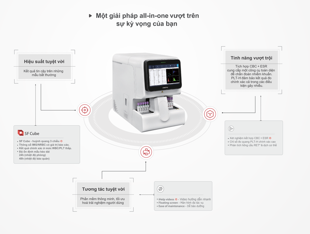 - Công nghệ phân tích tế bào dòng chảy thế hệ mới (SF Cube) cho khả năng phân biệt được các bạch cầu chưa trưởng thành và các tế bào bất thường khác như bạch cầu hạt chưa trưởng thành (IMG), hồng cầu lưới (RETs*) và tiểu cầu chưa trưởng thành (IPF).