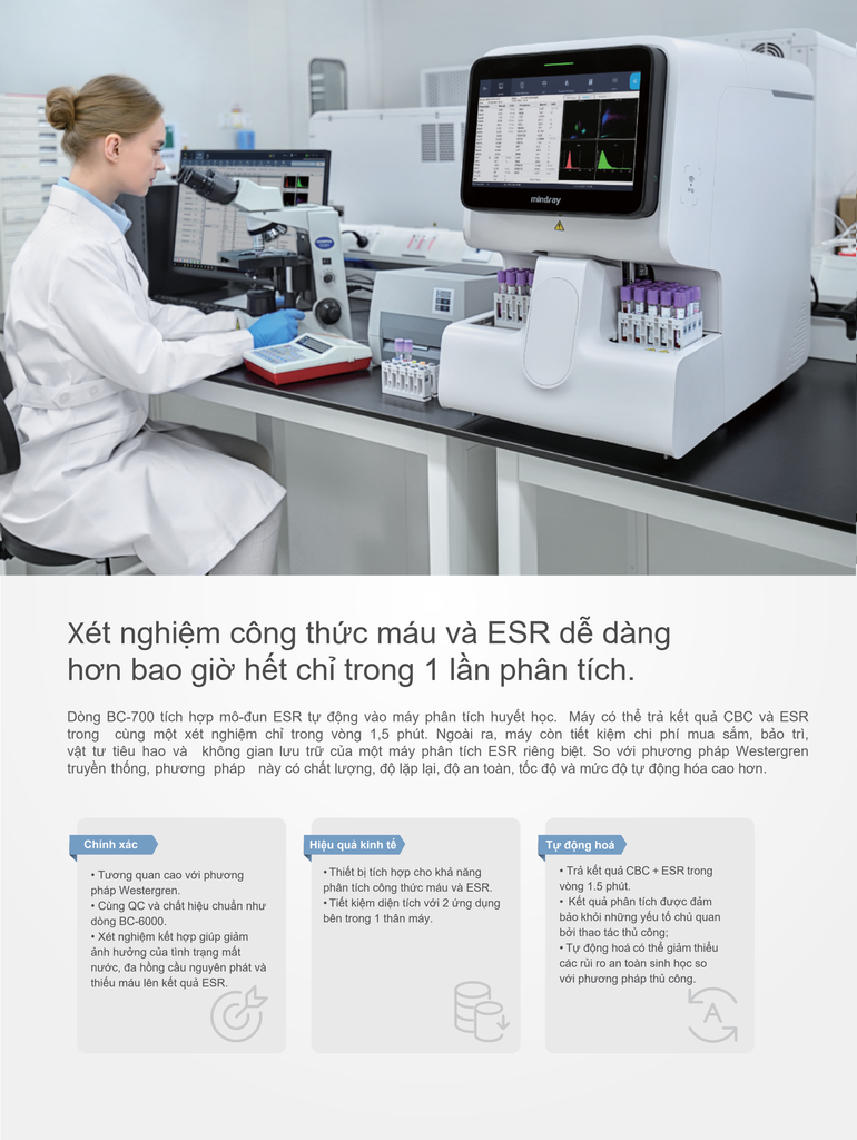 Mindray BC-760 là dòng máy xét nghiệm huyết học tự động 5 thành phần bạch cầu thế hệ mới nhất của Mindray. Với công suất xử lý mẫu cao, độ chính xác vượt trội, công nghệ quang học phân tích tế bào dòng chảy thế hệ mới (SF Cube) cho khả năng phân tích sâu các quần thể tế bào máu bất thường (hồng cầu lưới và các tế bào chưa trưởng thành), BC-760 là giải pháp tối ưu cho các bệnh viện tuyến tỉnh, tuyến trung ương và trung tâm xét nghiệm hiện đại.