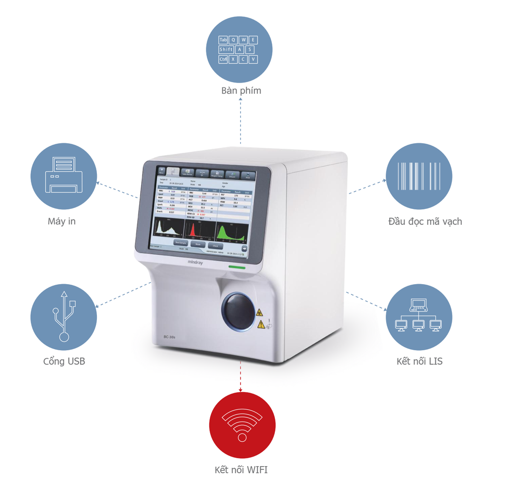 • Hỗ trợ đầy đủ kết nối LIS/HIS: hỗ trợ cổng LAN, USB, WiFi, chuẩn HL7, lưu trữ tới 200 000 kết quả (số liệu + đồ thị).